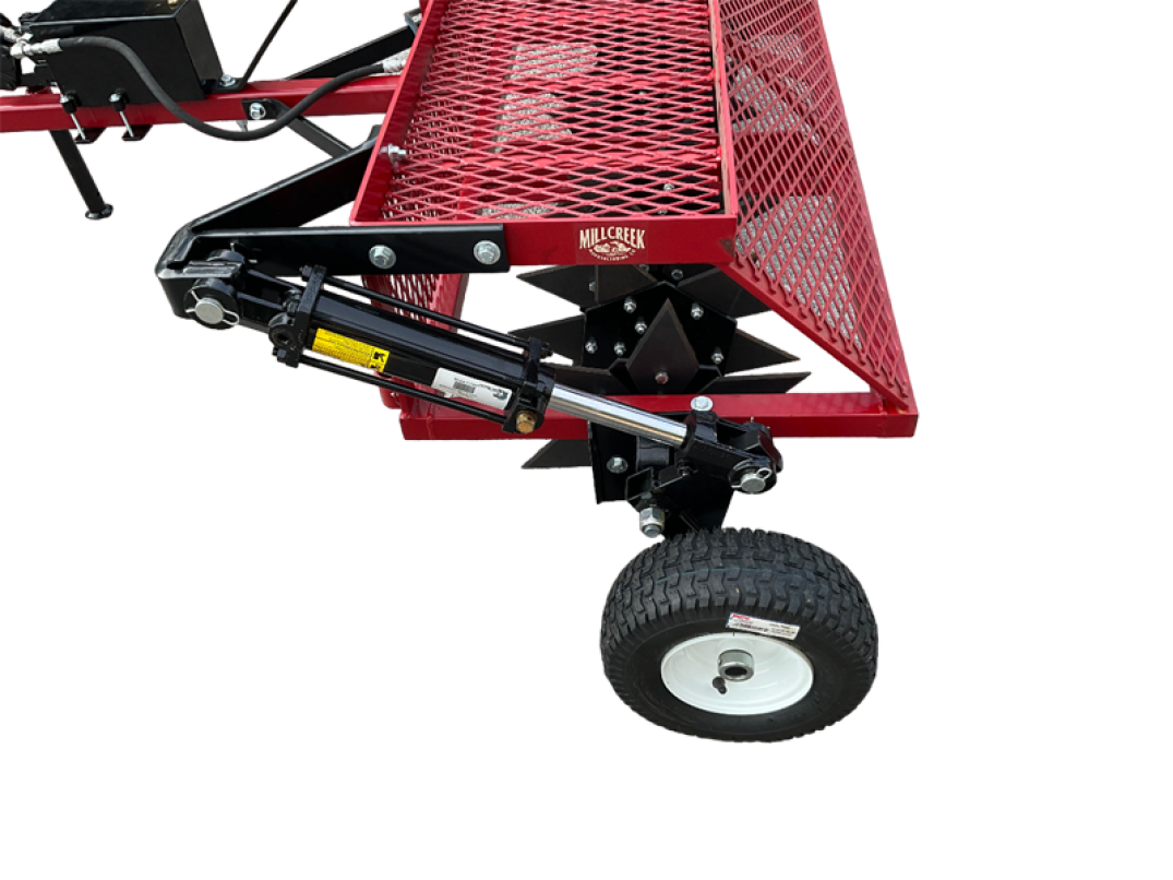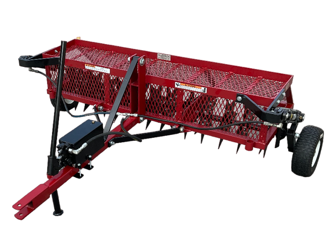 L'arieggiatore a traino 630-SM con 36 lame e sollevamento manuale della Millcreek è interamente costruita in acciaio e presenta un attacco a 3 punti.