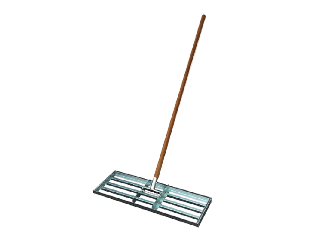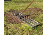 Il rastrello manuale livellante per prati modello LL-Deliuxe è in acciaio inox, con aste di sostegno chiuse, larghezza 86 cm, profondità 26 cm, spessore 2 cm, diametro portamanico 28 mm.
