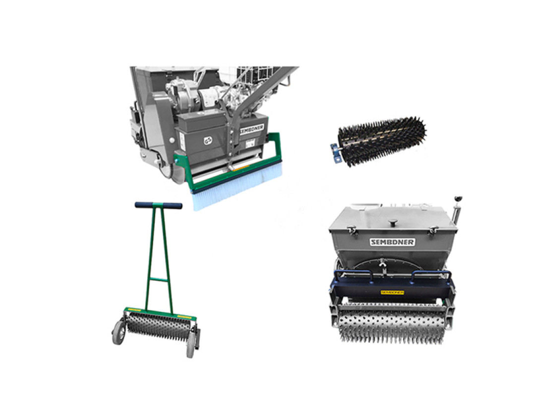 Kit risemina formato da rullo ad aghi, zavorra anteriore, spazzola copertura seme e manico completo di cuscinetti e pulisci rullo per risemina manuale.