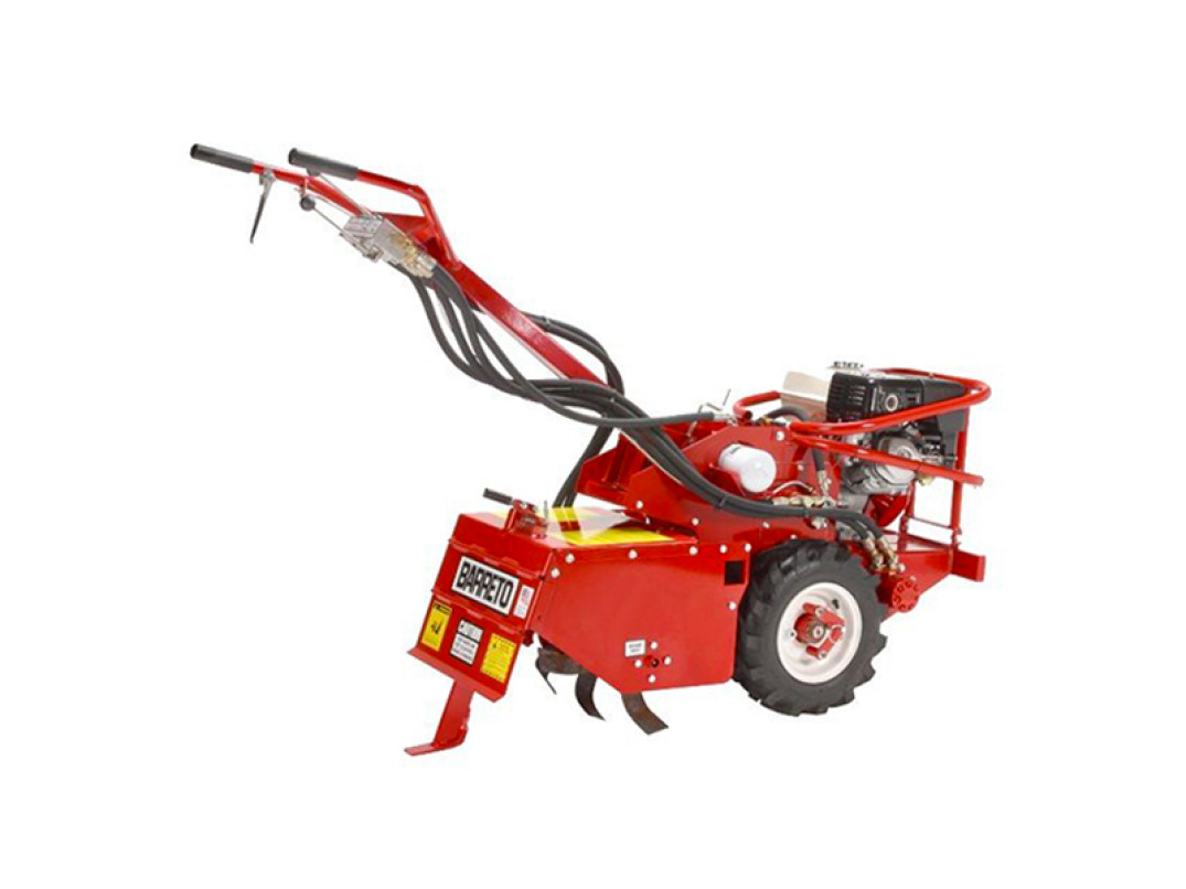 Motocoltivatore Barreto usato con motore 9 hp Honda, completamente idraulico, adatto per lavorazioni in qualsiasi tipo di terreno, larghezza di lavoro 40 cm, larghezza totale 53 cm, lunghezza 91 cm, altezza 111 cm, manico a due leve regolabile sia in altezza che lateralmente, peso 208 Kg, rotore a doppio senso di rotazione