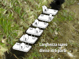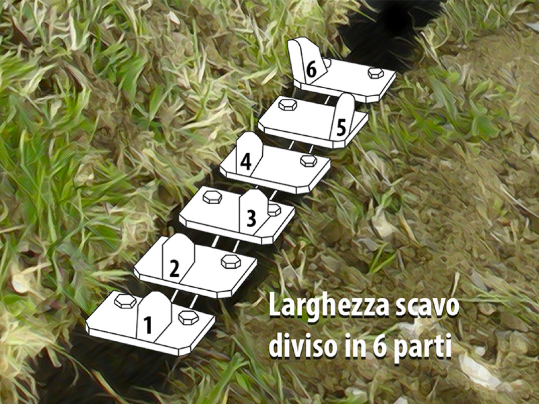 La suddivisione della larghezza dello scavo nella catena da 40 cm viene eseguita in 6 parti, a cominciare dalla parte centrale e successivamente verso l’esterno, fino a raggiungere gli 8 cm, mentre con la barra da 50 cm avviene in 7 parti.