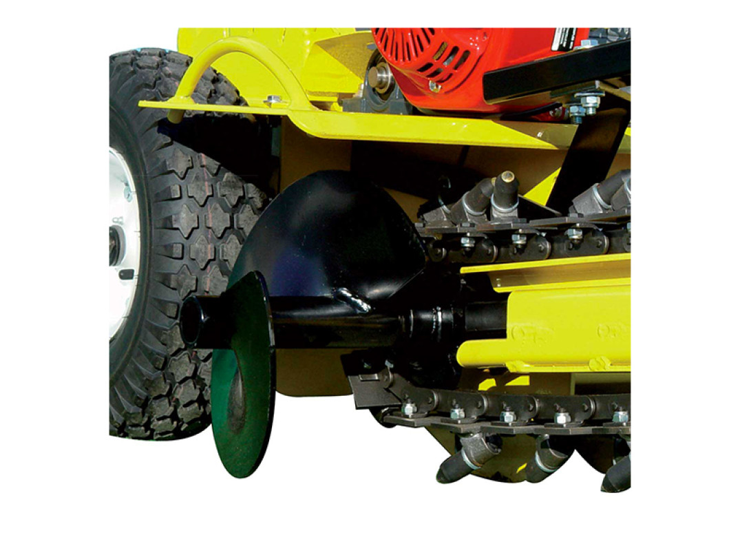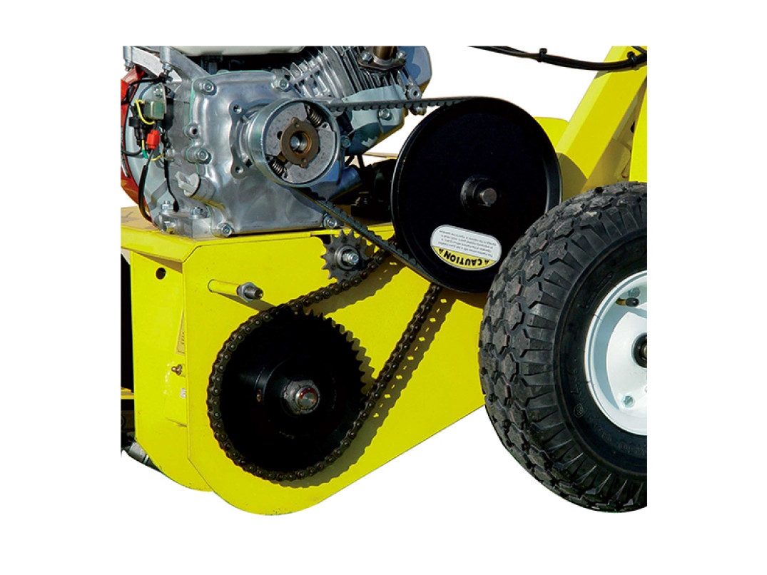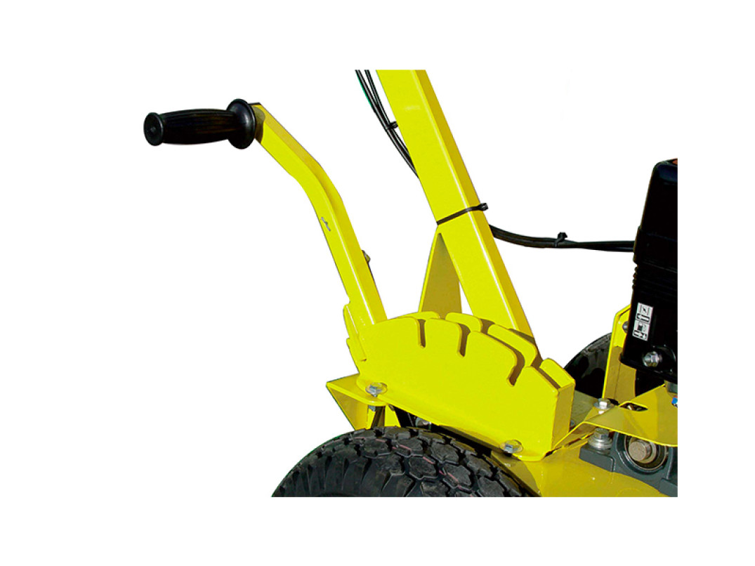Un sistema meccanico blocca ruote, garantisce una perfetta stabilità durante il lavoro anche in presenza di sassi. La trasmissione a cinghia con frizione centrifuga permette di lavorare nelle condizioni più difficili senza causare nessun danno.