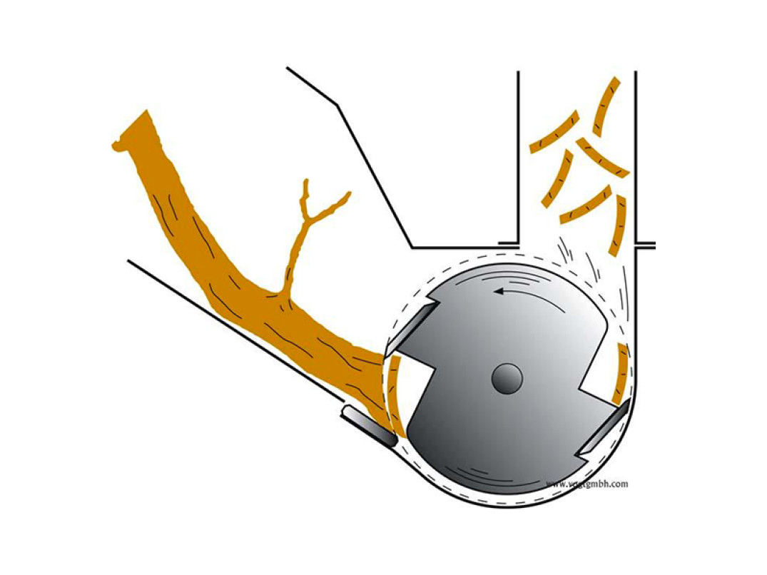 La tecnologia a tamburo di taglio JoBeau infatti permette di aspirare i rami nell'imboccatura, triturarli ed estrarre correttamente il materiale cippato.