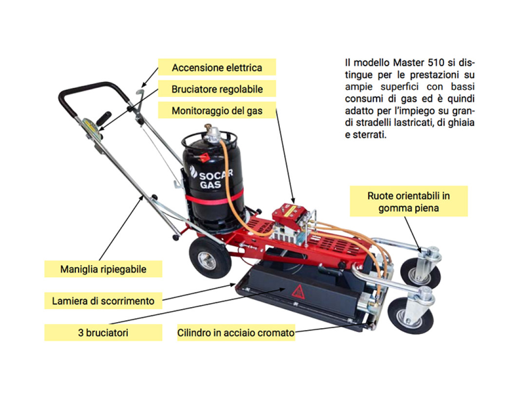 Il diserbo ecologico a raggi infrarossi Master-510 ha funzionamento a spinta, è dotato di alimentazione a gas con bruciatore.