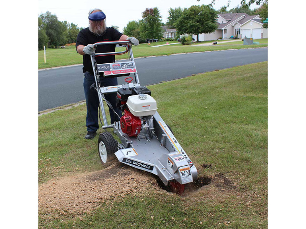 La tecnologia a perno oscillante offre una maggiore facilità d'uso e comfort per l'operatore. È sufficiente avvicinare il fresaceppi al ceppo, inserire il blocco della ruota a leva singola e utilizzare l'azione girevole che scivola a destra e a sinistra per eliminare il ceppo.