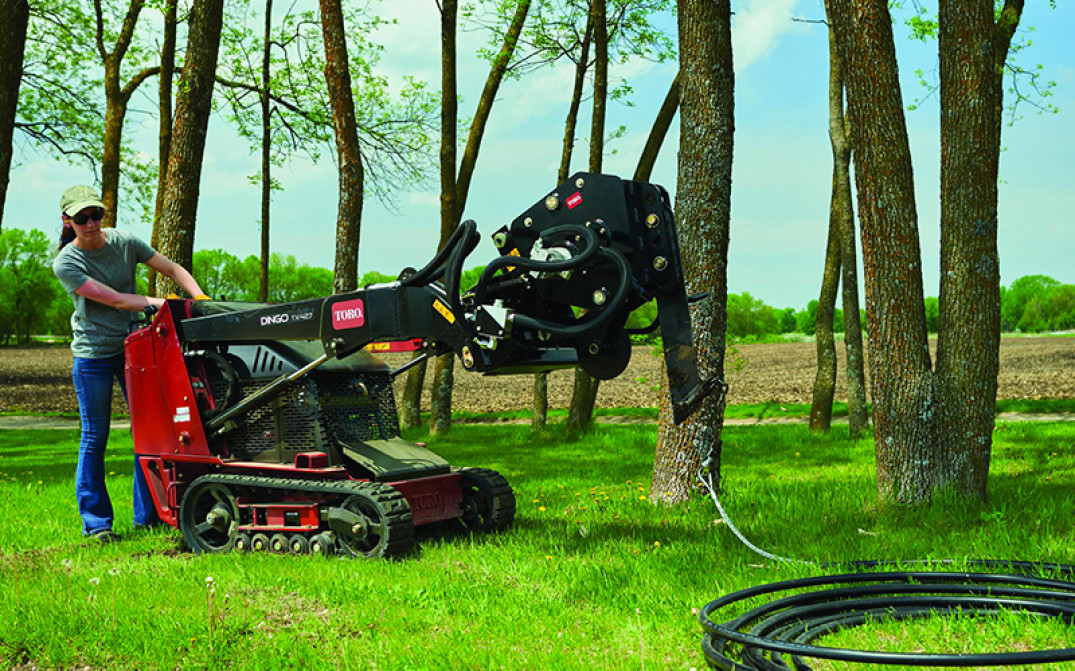 L'interratubo per Mini Skid Dingo® ha una lama di spessore 10 mm e raggiunge una profondità di lavoro da 15 a 30 cm. È completo di maglie tira tubo da 3/4" fino a 1-1/4".