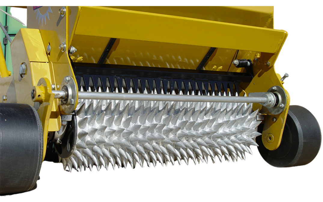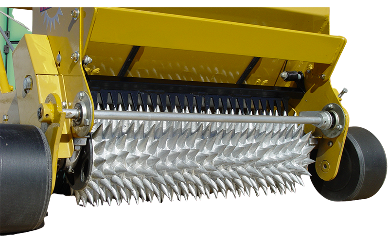 Il rullo frontale, formato da singoli dischi in ghisa, portanti 18 punte ciascuno, crea un ideale letto di semina con circa 1000 fori per mq. La tramoggia ha una capacità di 45 litri.