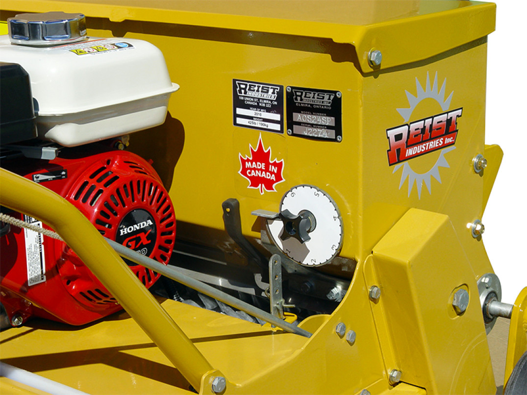 La rigeneratrice della Reist modello AOSCS24SP, con motore 5.5 hp Honda e trasmissione idrostatica, permette una veloce semina in condizioni di prato già esistente o terreno sodo. È dotata di rullo anteriore a puntali e rullo posteriore liscio ed ha una larghezza di lavoro di 61 cm.