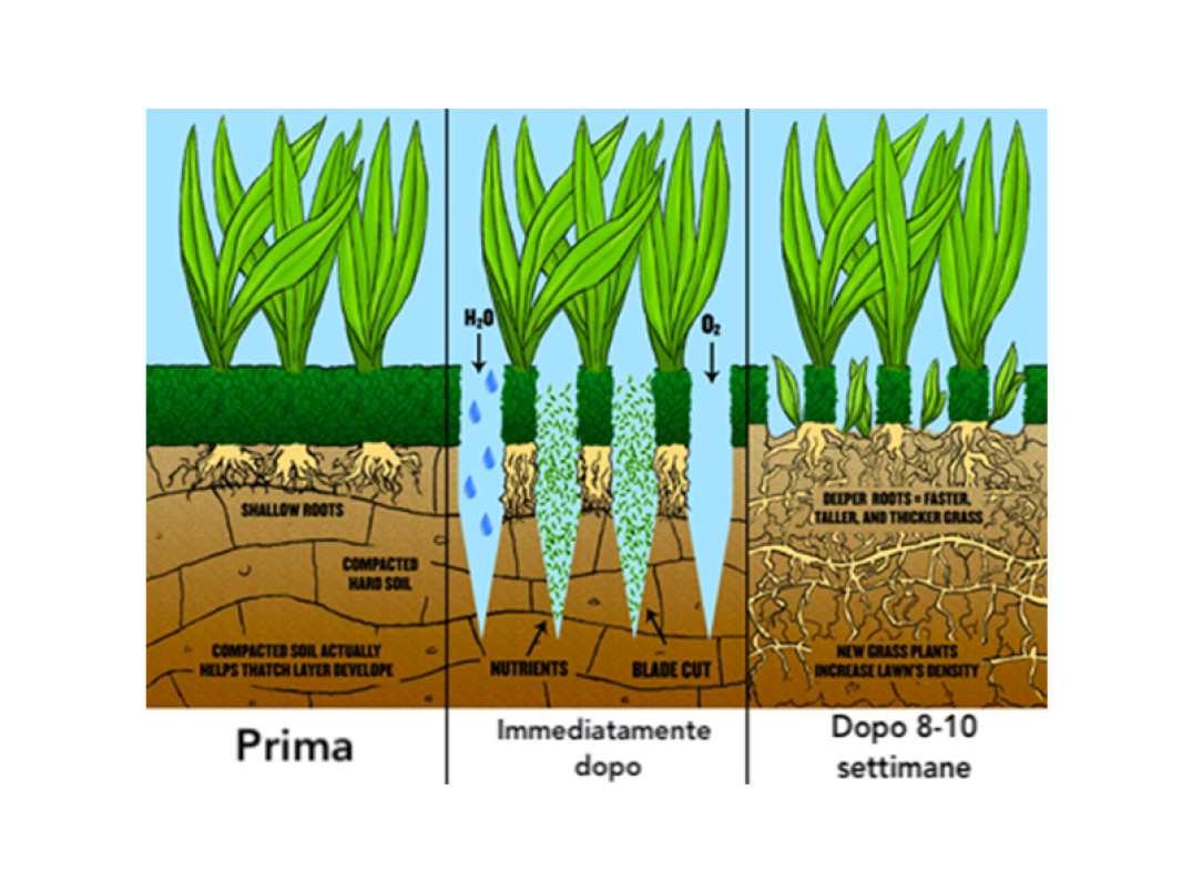 La creazione di fori favorisce il movimento di ossigeno, acqua e sostanze nutritive che migliorano l'apparato radicale in profondità.