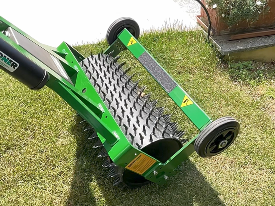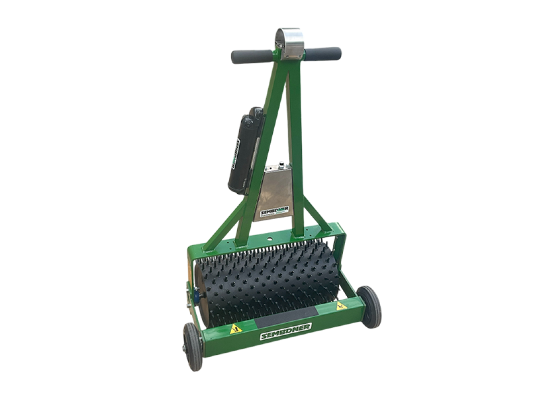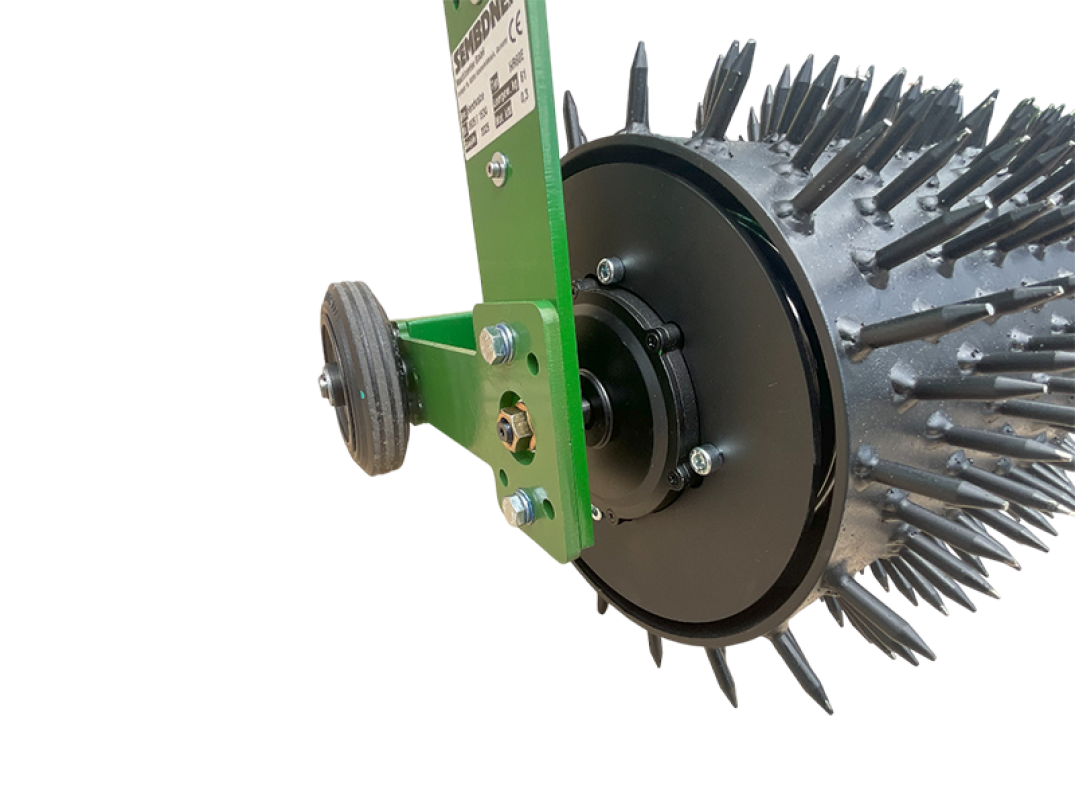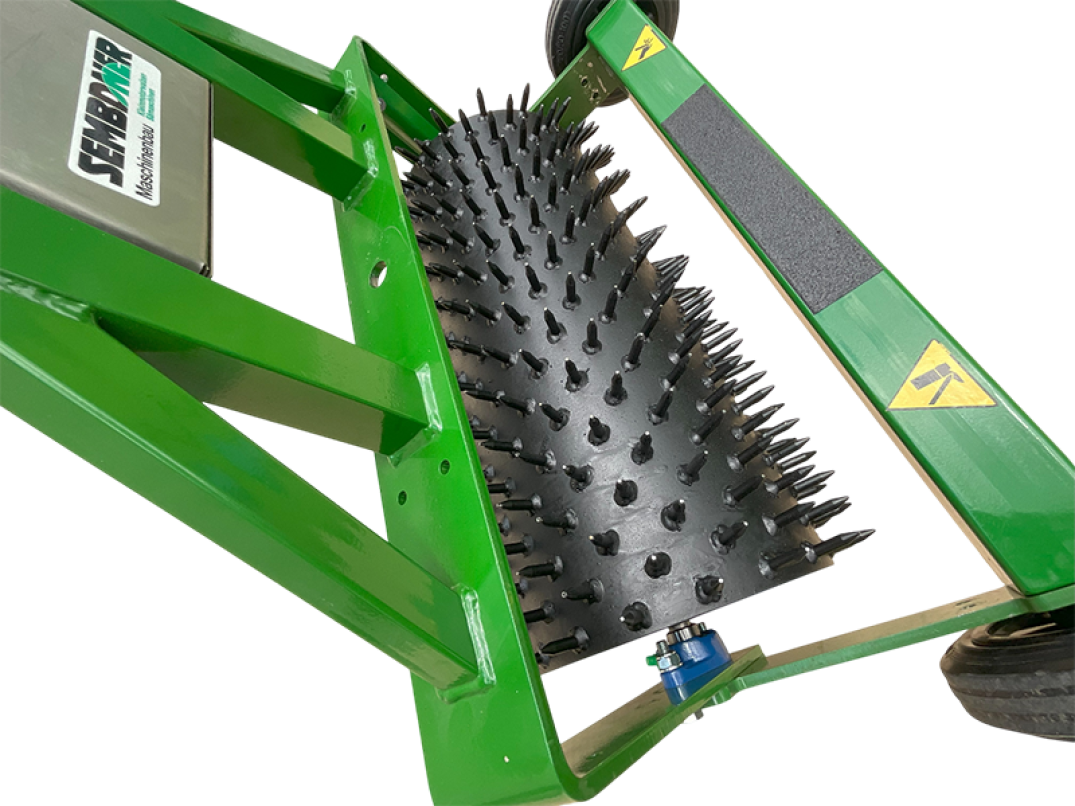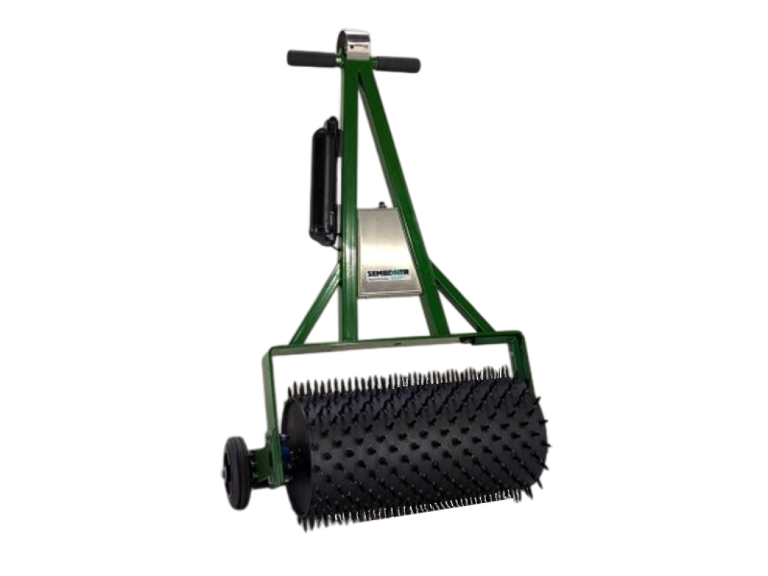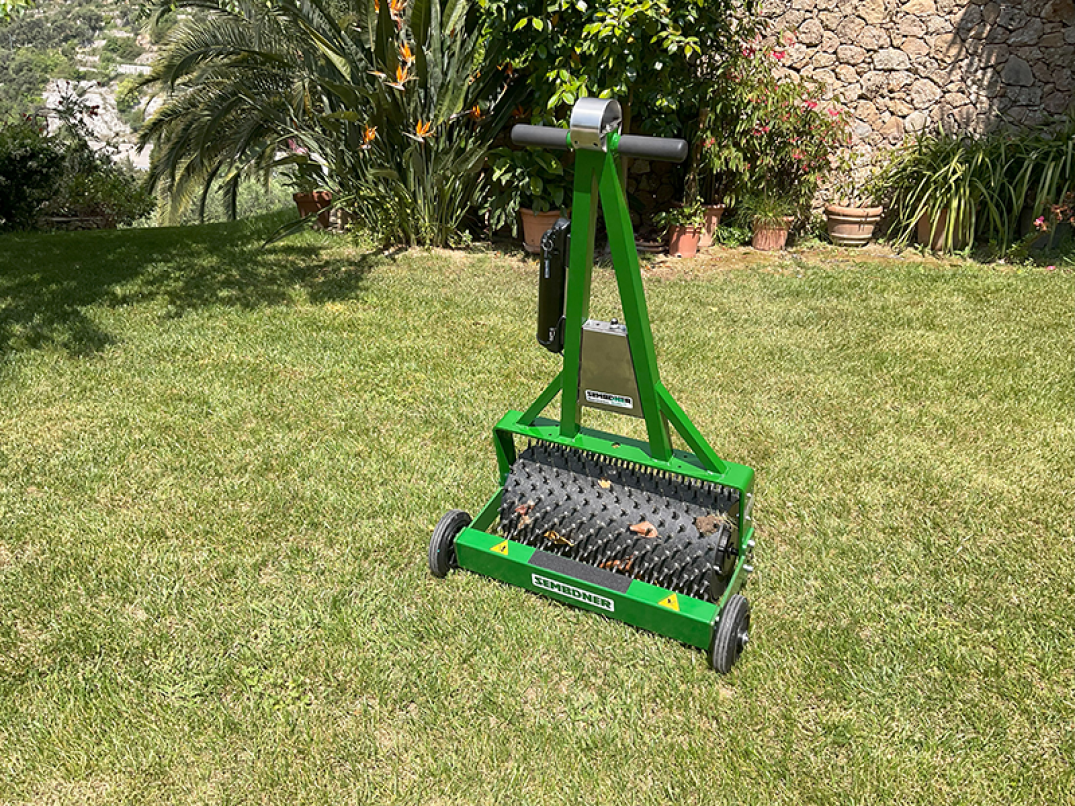 Il rullo ad aghi semovente a batteria per semine-risemine della Sembdner ha una larghezza di lavoro di 60 cm, realizza 1300 fori al mq e copre fino a 1000 mq con una carica.