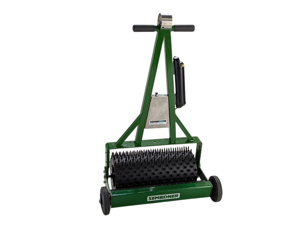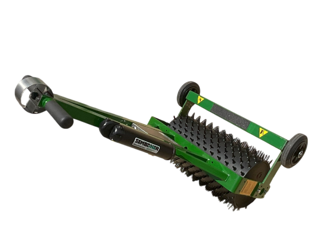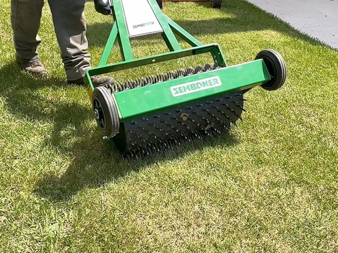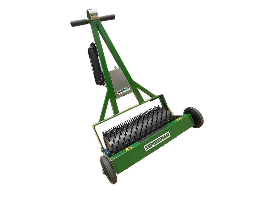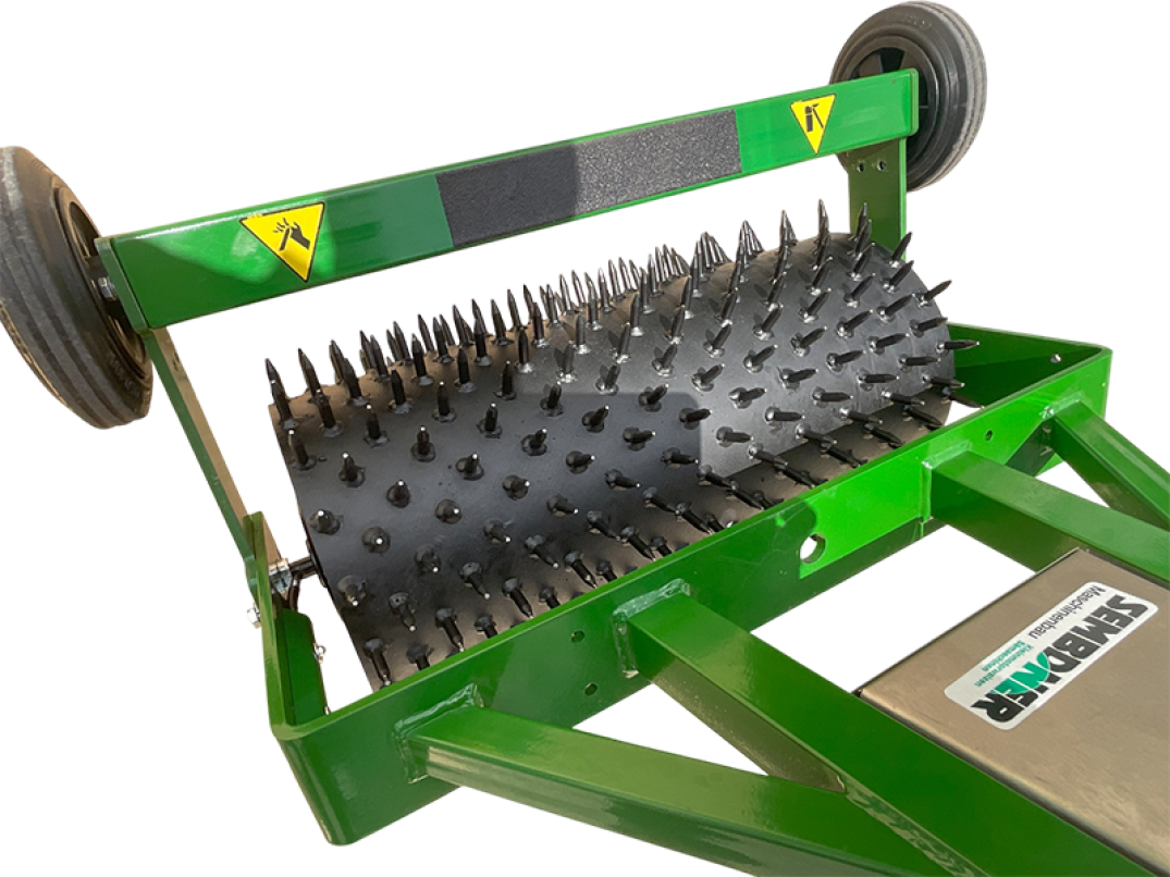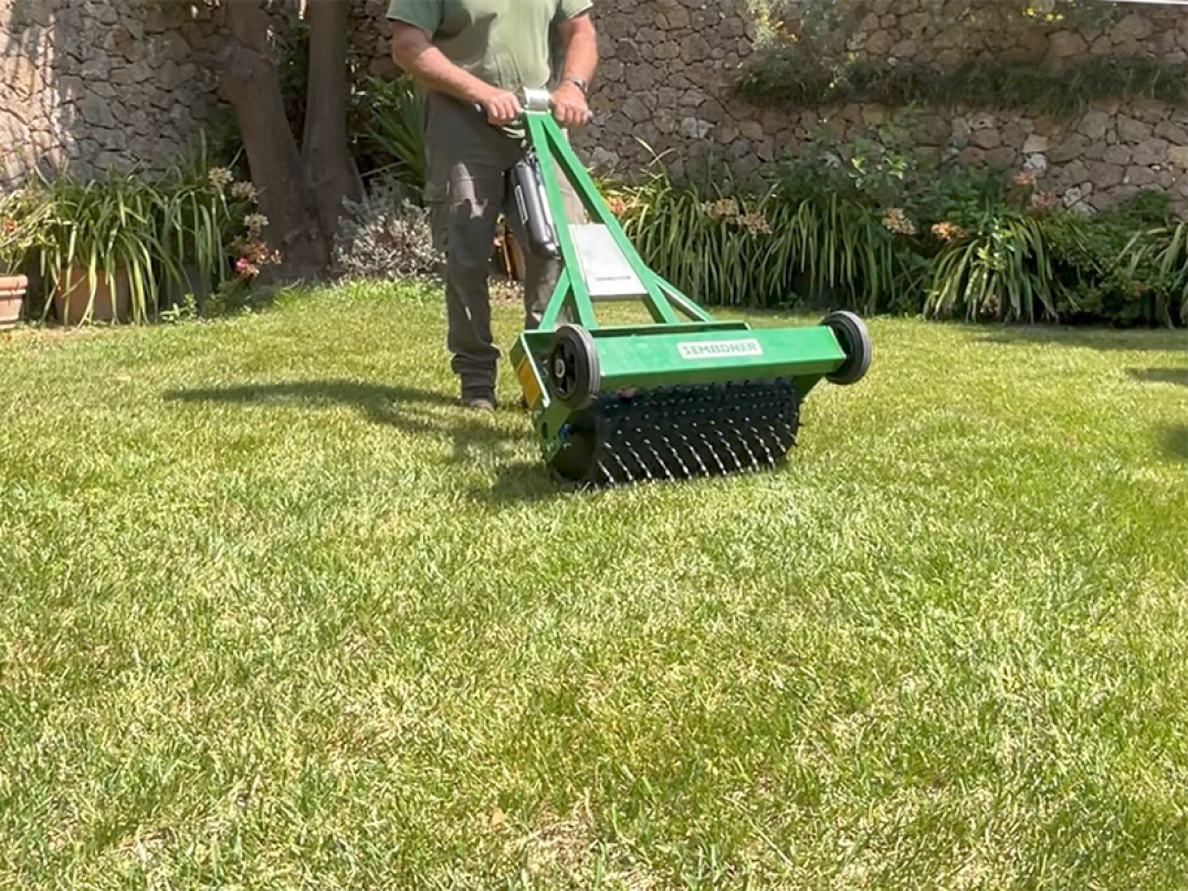 Il rullo ad aghi semovente a batteria per semine-risemine della Sembdner ha una larghezza di lavoro di 60 cm, realizza 1300 fori al mq e copre fino a 1000 mq con una carica.