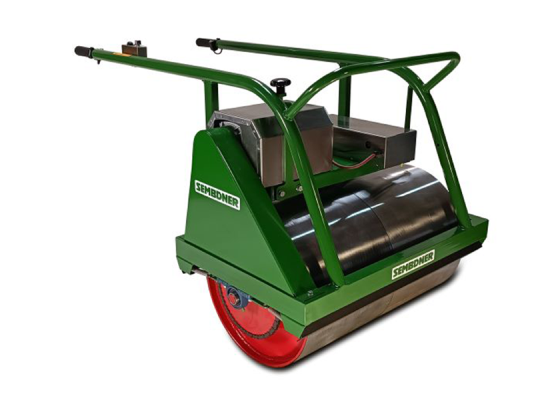 Il rullo compattatore a batteria modello KM-1-E è dotato di rullo continuo con larghezza di lavoro di 80 cm, con una singola ricarica copre circa 8000 m².