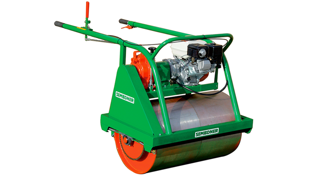 Rullo compattatore semovente modello KM-1 a rullo singolo, ha motore 5.5 hp Honda, trasmissione meccanica avanti e retro.