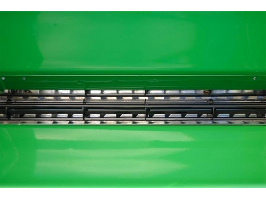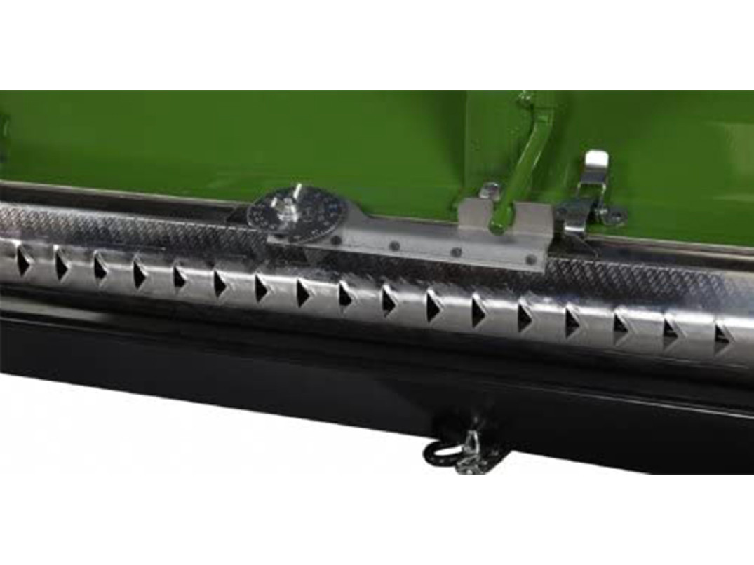 La tramoggia in acciaio è verniciata a polvere per una maggiore durabilità, dispone di leva per chiudere il cursore e arrestare il flusso di caduta. Il fondo/scivolo a scatto è in acciaio inox regolabile con aperture triangolari distanziate di 2,85 cm e velocità variabile.