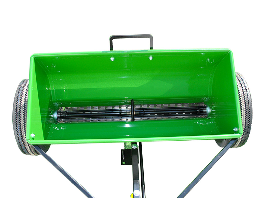 La seminatrice è inoltre dotata di rotore a tre barre in acciaio per l'agitazione interna, piatto di spargimento per distribuire uniformemente il materiale sulla superficie e cuscinetti porosi impregnati d'olio.