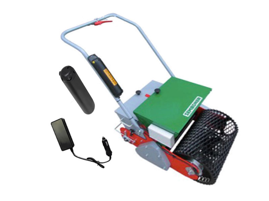 La seminatrice a batteria RS50E-KIT della Sembdner ha in dotazione due batterie, una larghezza di lavoro di 50 cm e capacità della tramoggia di 40 lt. È completa di carica batterie 230V e un carica batterie per auto 12V.
