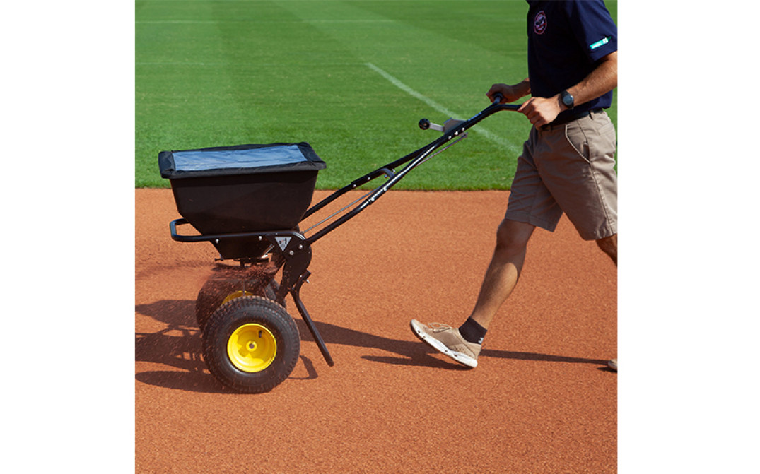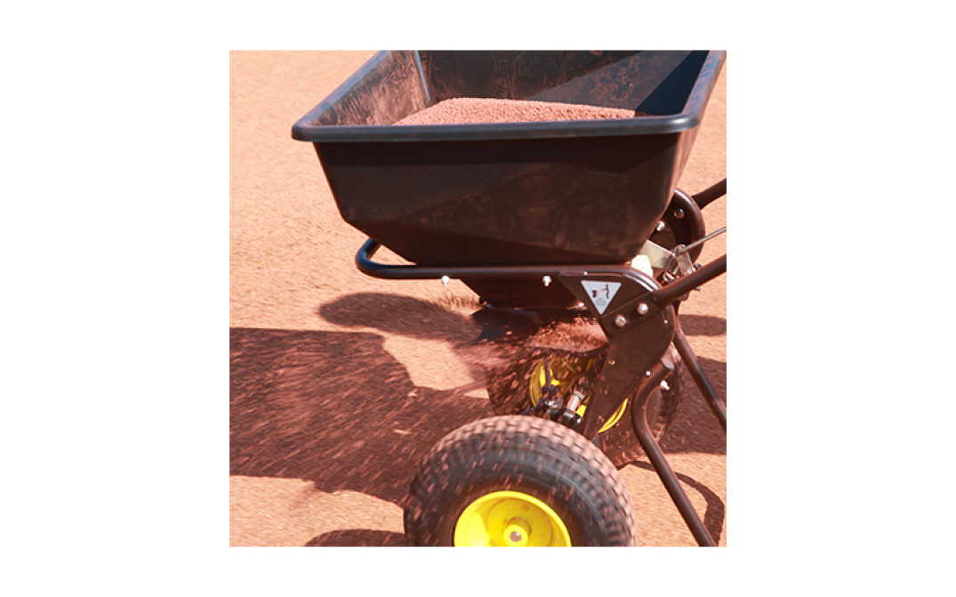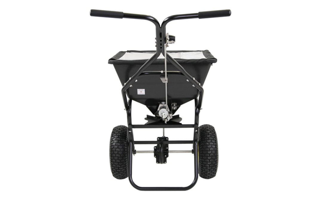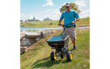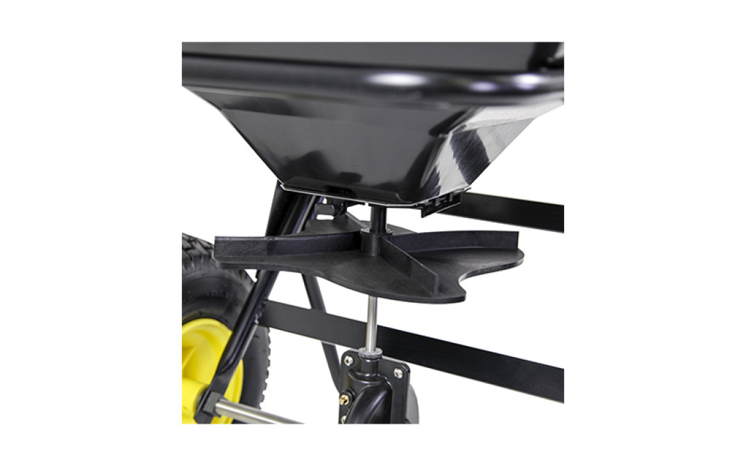 Lo spandiconcime è inoltre caratterizzato da telaio in acciaio verniciato a polvere, coppia conica rinforzata con ingranaggi in metallo chiusi per una maggiore durata. Le ruote pneumatiche di grandi dimensioni 13” x 5", aumentano la trazione e riducono i danni all'erba.