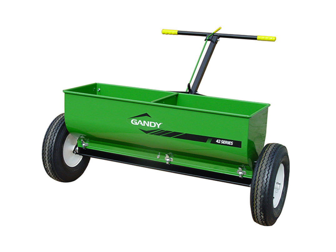 Lo spandisabbia manuale a spinta lineare per sintetico 42H16-FR della Gandy offre una larghezza di distribuzione di 107 cm e capacità della tramoggia di 102 kg.