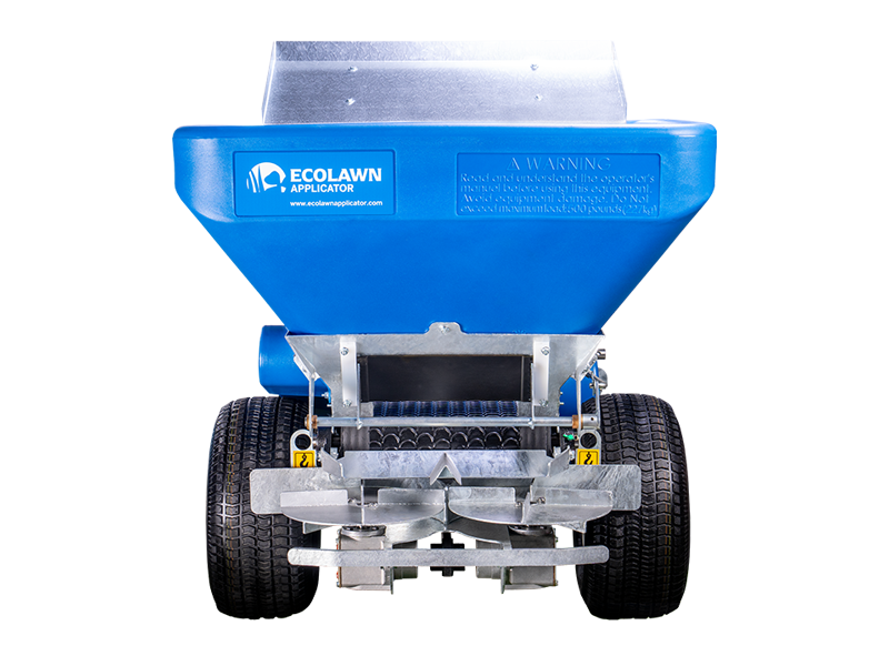 Il sistema di trascinamento dell’ECO-250-G trasporta il materiale verso un agitatore che smembra i grumi e sposta il materiale in modo uniforme attraverso la botola. A questo punto il materiale precipita sui due piatti a rotazione contrapposta che spandono il prodotto sul manto erboso con uno schema di diffusione a 180 gradi.