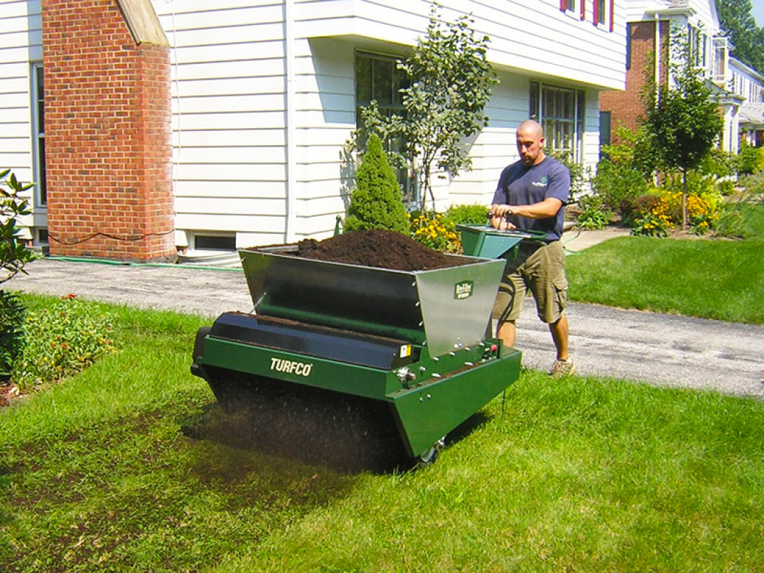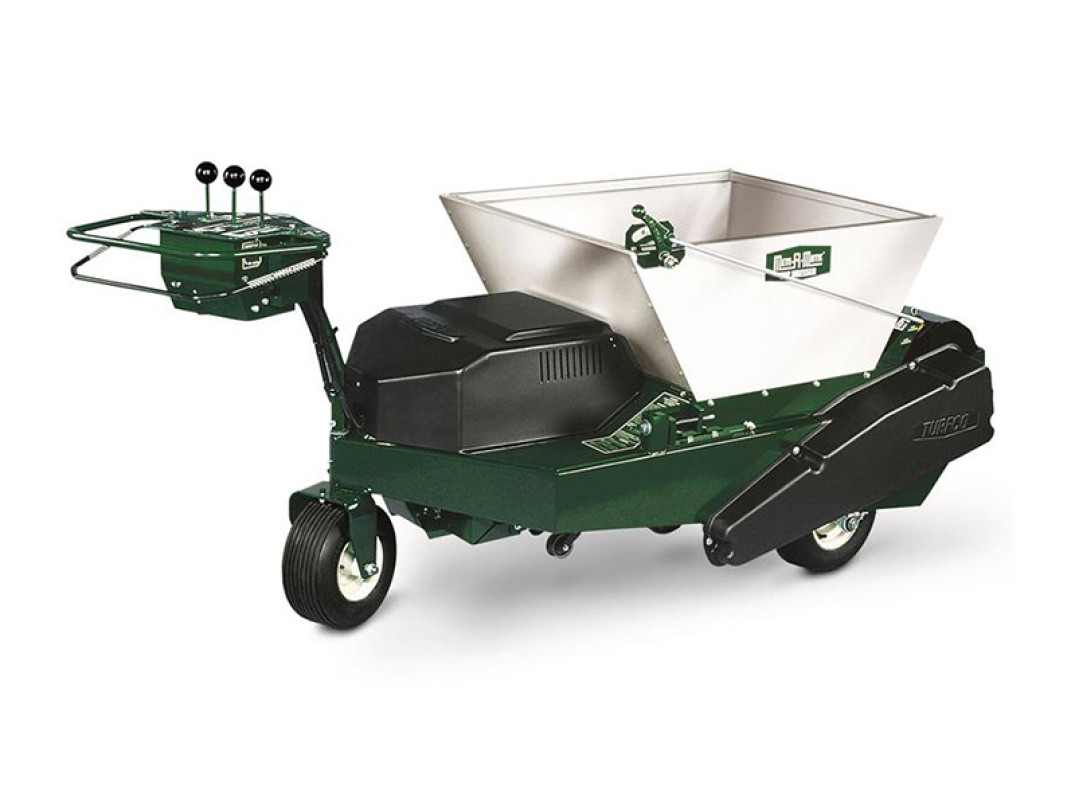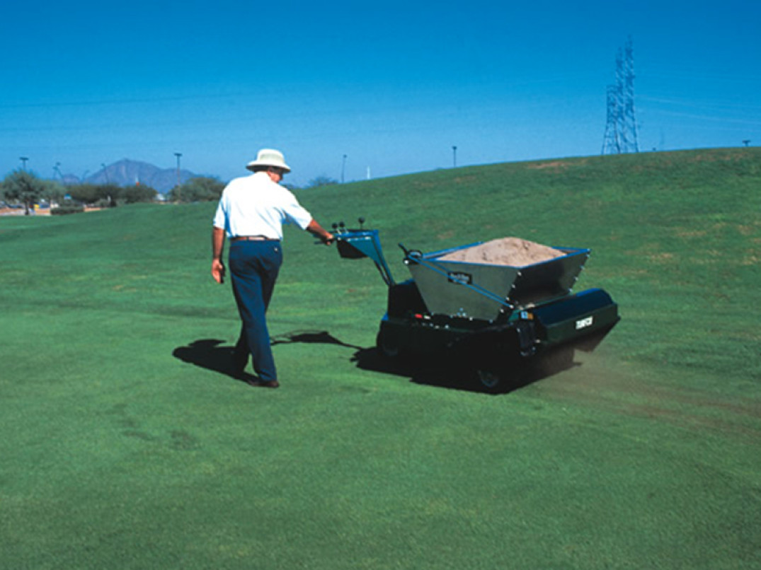 Lo spandisabbia semovente della Turfco è l'ideale per i piccoli tappeti erbosi e le ristrette zone verdi.