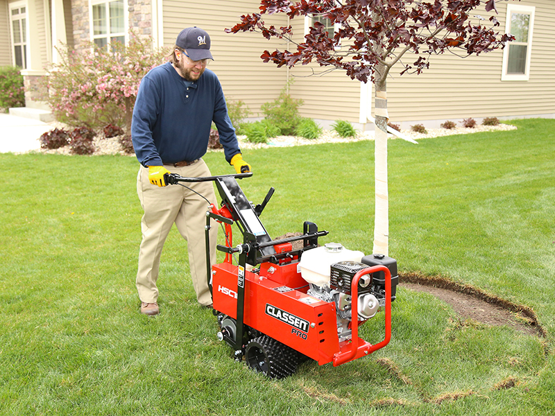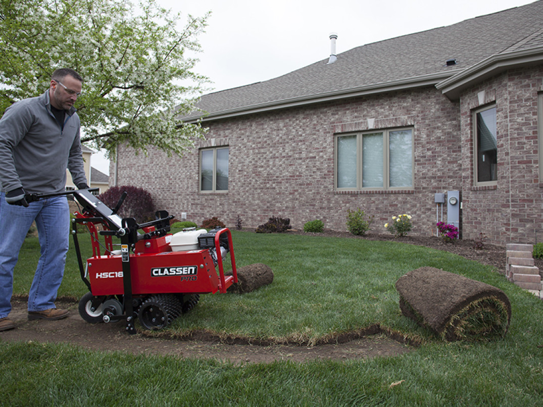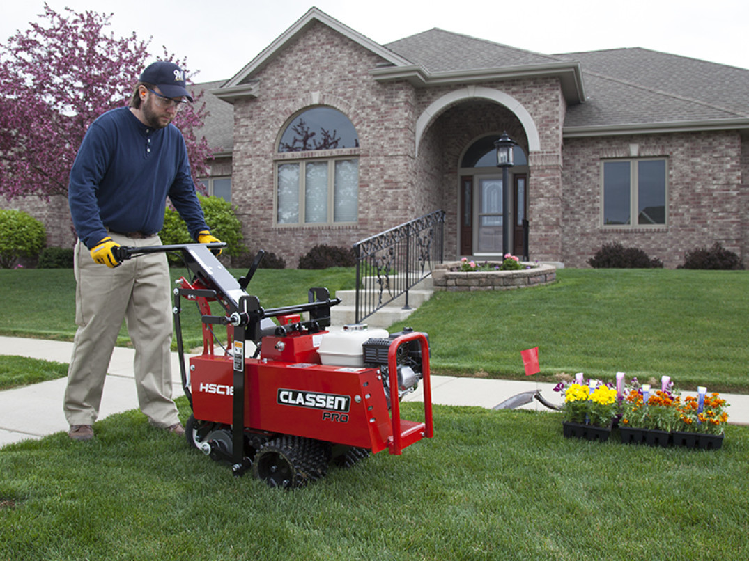 Il tagliazolle Classen idrostatico è compatto, dotato di motore Honda 5.5 hp e presenta una larghezza di taglio di 46 cm.
